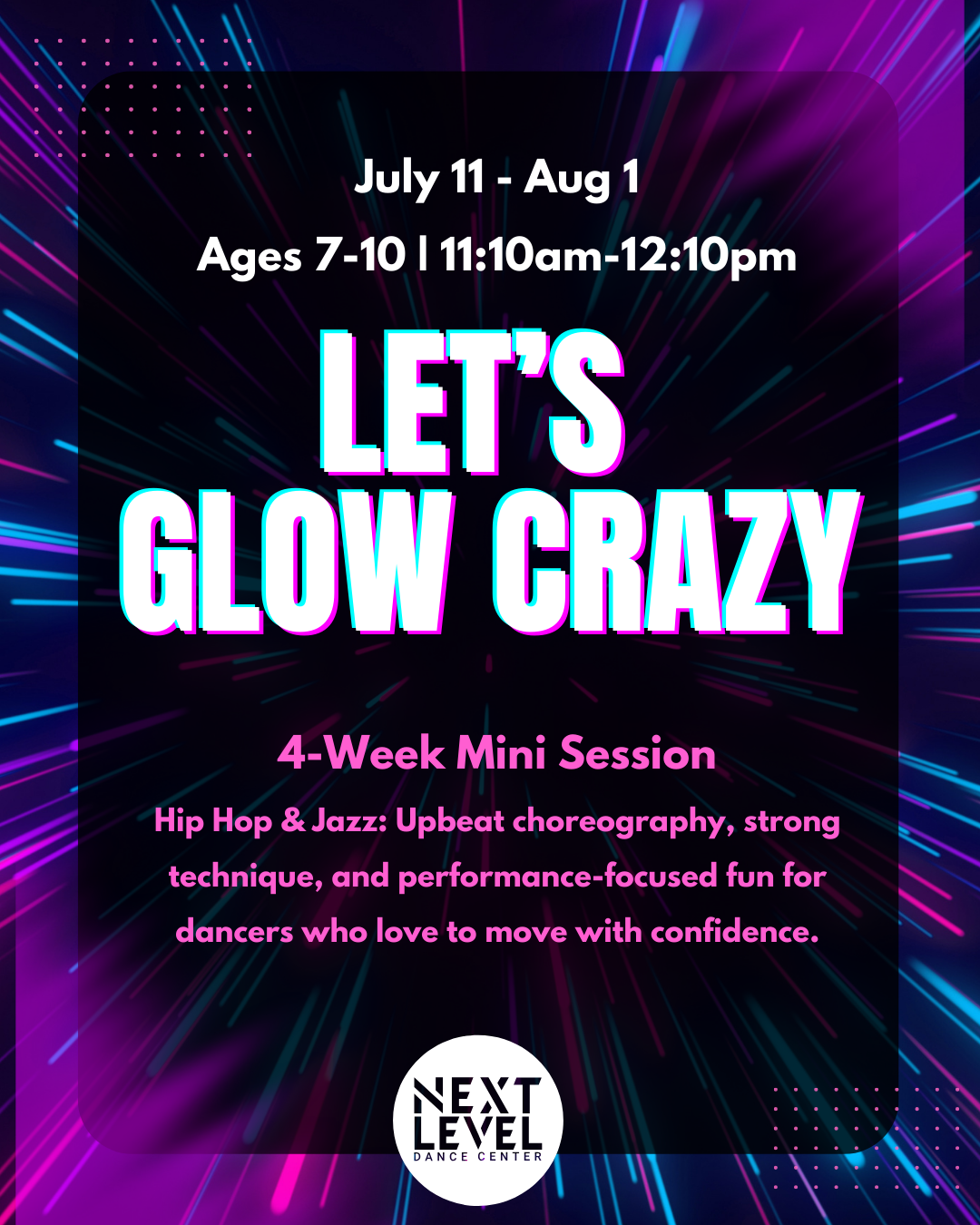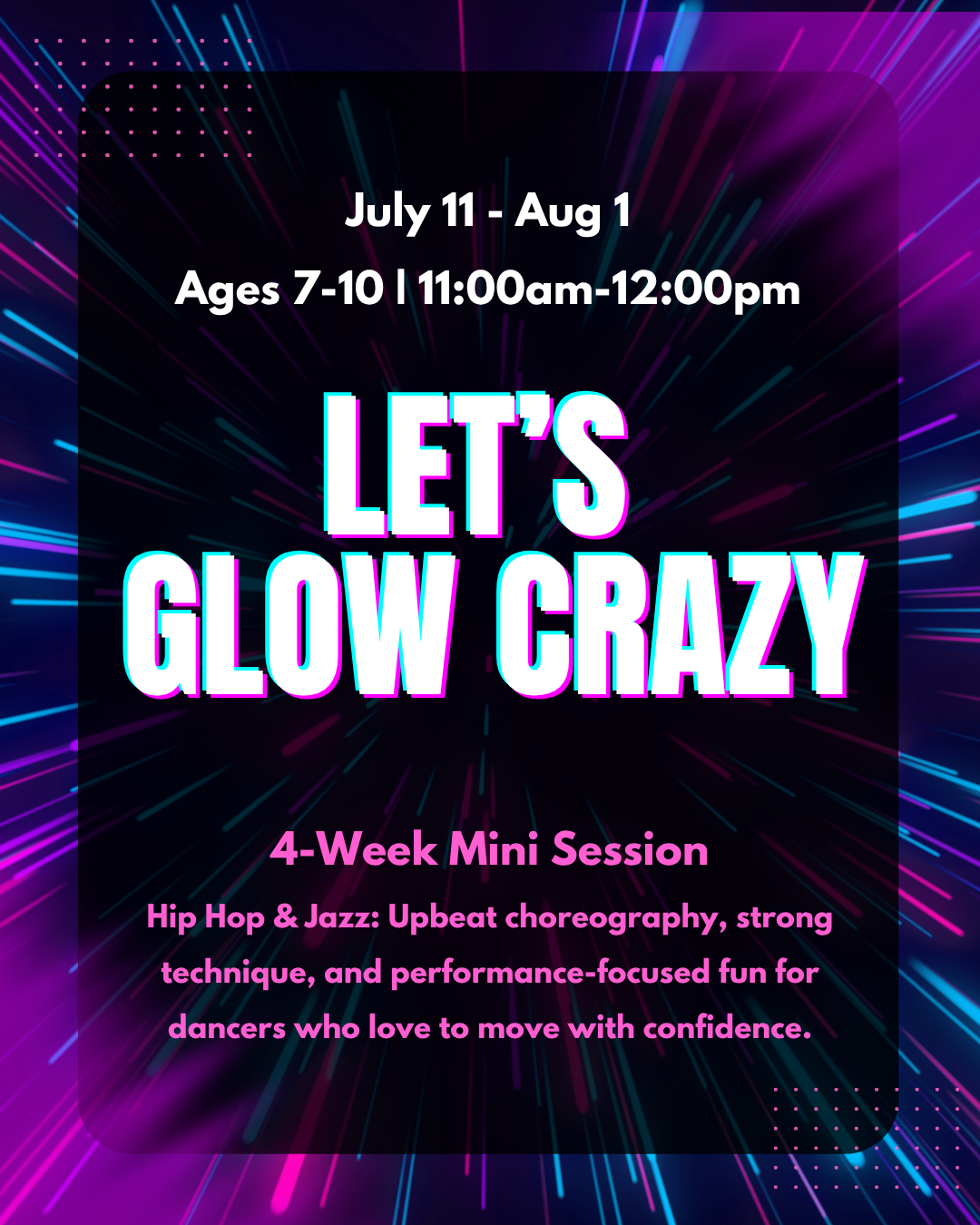 Turn up the music and bring the energy. Glow Crazy is a high-energy summer dance experience blending hip hop grooves with strong jazz technique.