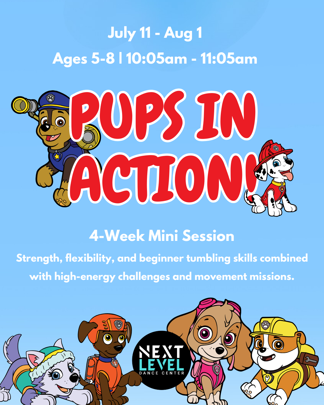 Calling all energetic movers. Pups in Action combines beginner acrobatics with playful obstacle courses and high-energy games inspired by brave rescue pups.